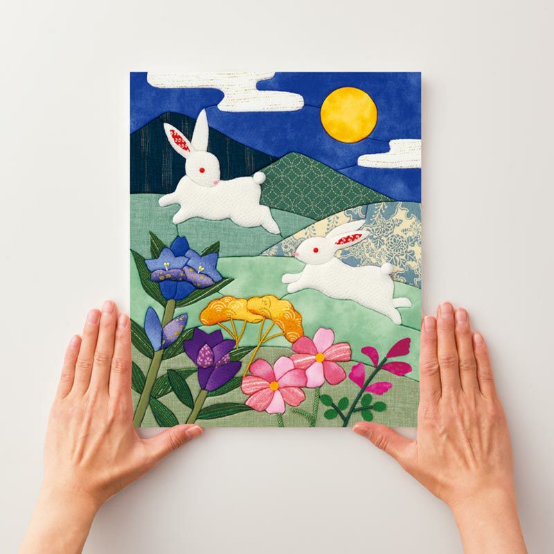 月夜の跳ねうさぎを上品な和柄で作る趣深い絵柄。別売りの額に入れて飾ると作品が引き立ち、お部屋をシックに彩ります。