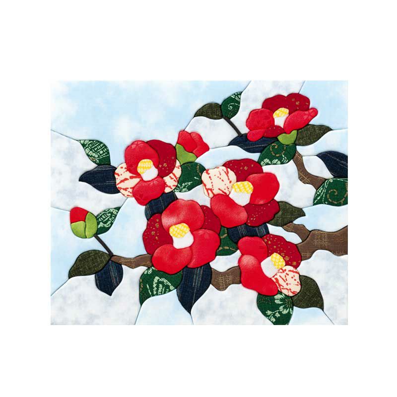 コットン布、ちりめん布、ジャガード、緞子など13種類の布を使用して、椿の花を可憐に仕上げます。