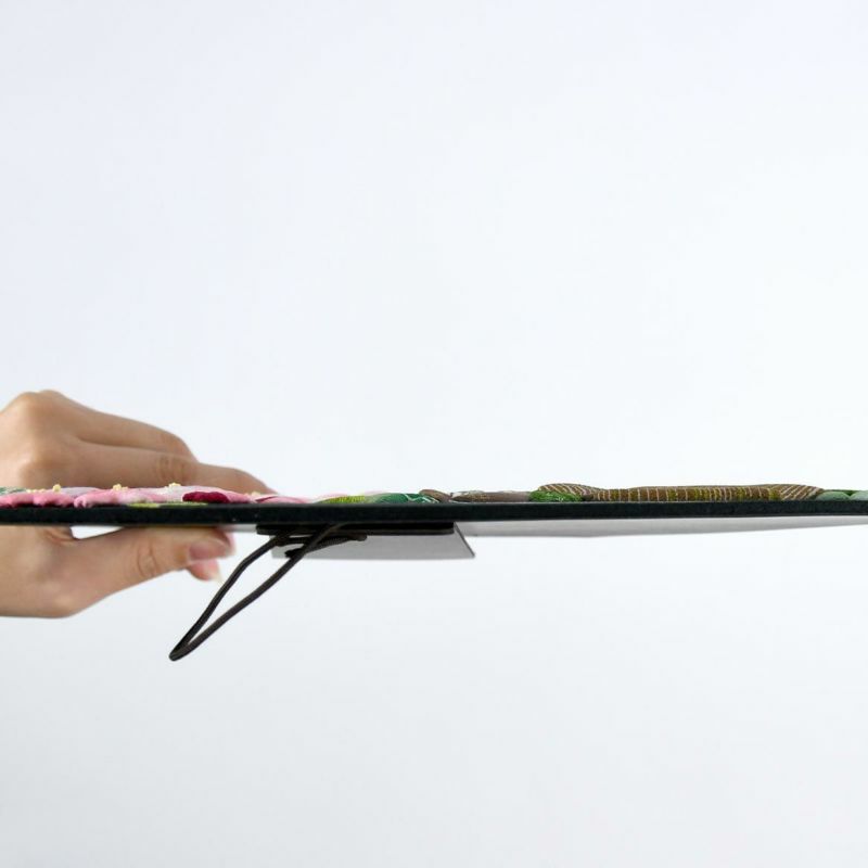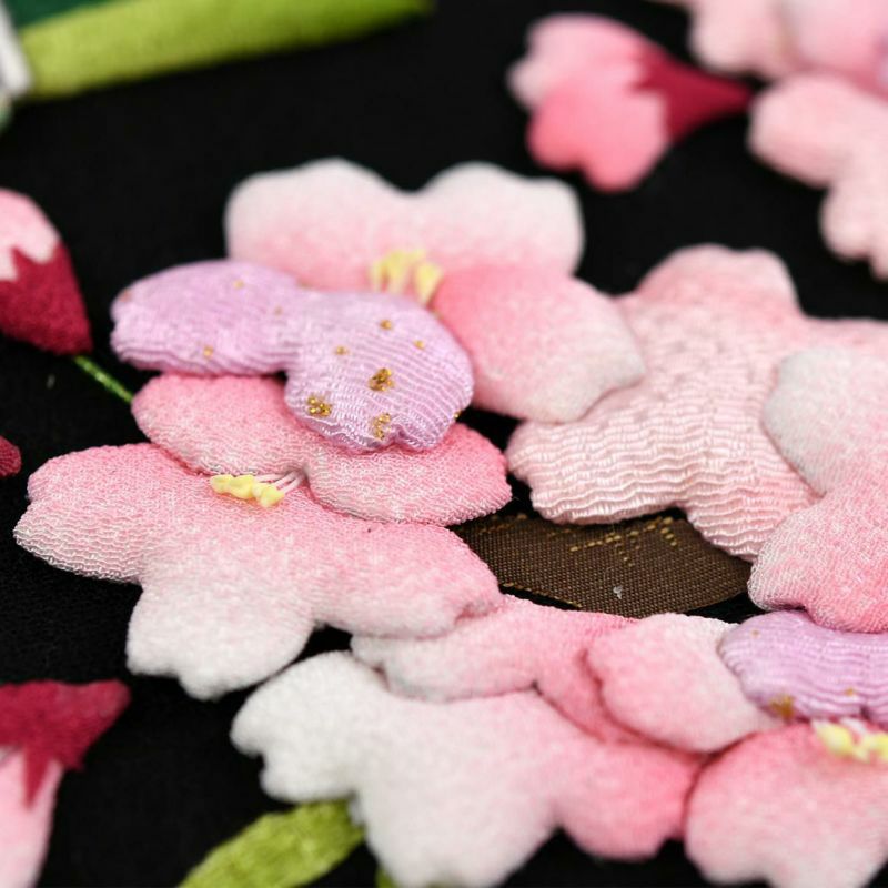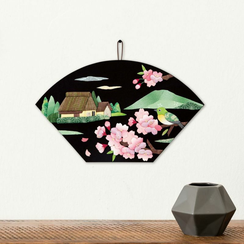 黒地の土台に色鮮やかなモチーフが映えます。土台は末広がりで縁起の良い扇型にしています。
