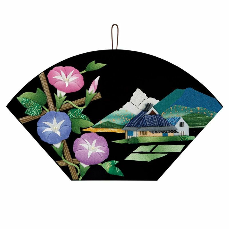 土台は末広がりで縁起のよい「扇」型。黒地なので色鮮やかな押絵パーツがより映え、際立ちます。
