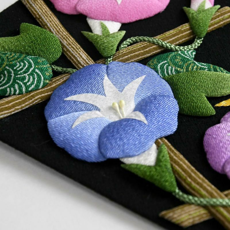 朝顔はちりめん布のグラデーションを活かし立体的に見えるように表現します。花の色は上品でみずみずしい色を選びました。