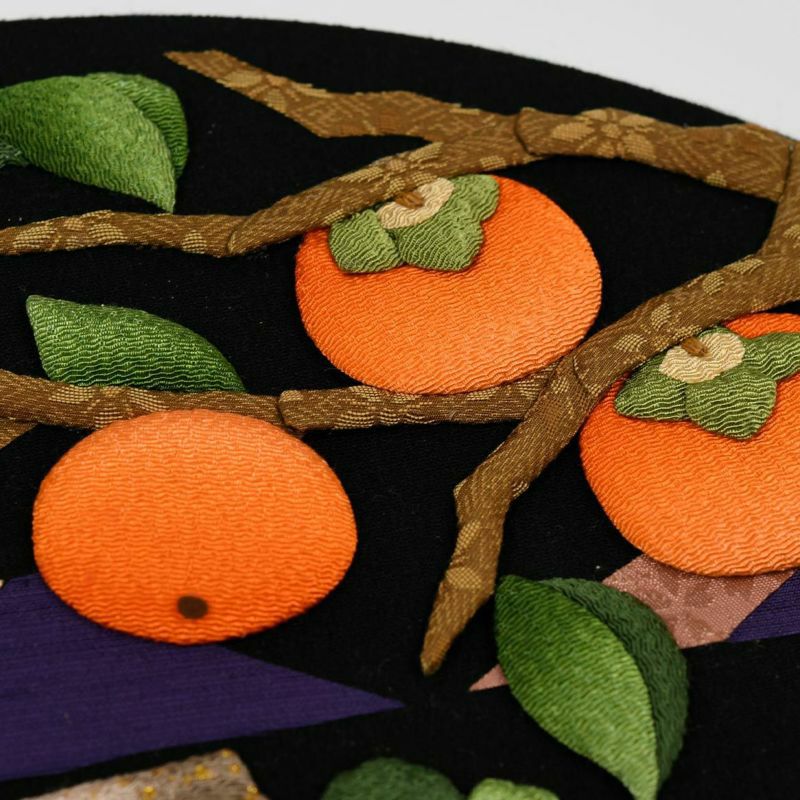柿はちりめん布のぼかし部分を活かして作ります。夕焼け色の実がなった柿の木は、なんとも郷愁を誘います。