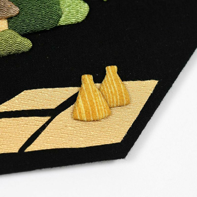 土台は末広がりで縁起のよい「扇」型。黒地なので色鮮やかな押絵パーツがより映え、際立ちます。