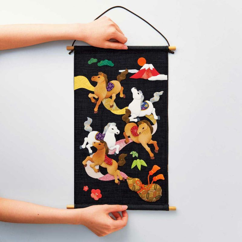 「瓢箪から駒」ということわざをテーマに、5頭の馬が元気よく瓢箪から飛び出す様子が描かれた絵柄で、のびのびとした馬たちの姿に思わず笑みがこぼれます。1年の始まりに、お部屋を華やかに彩りませんか?