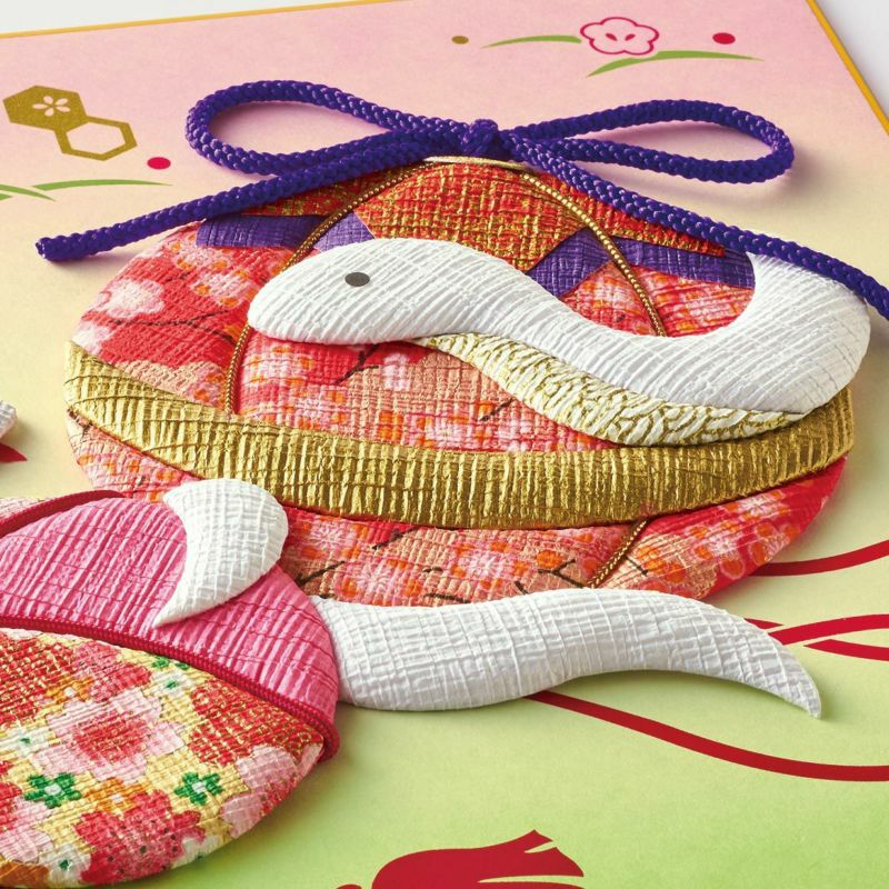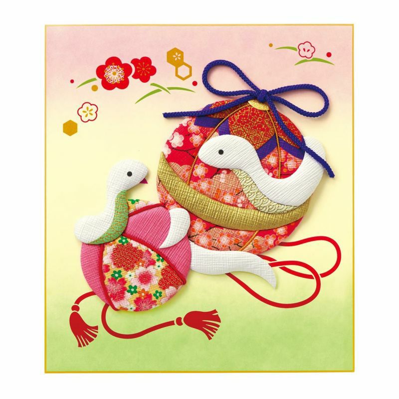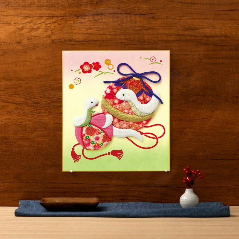 華やかで優美な鞠と親子ヘビの姿が微笑ましい色紙飾り。新しい年の幸運を願い、手作りの縁起物を飾りませんか。
