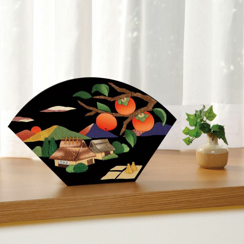 土台は末広がりで縁起のよい「扇」型。黒地なので色鮮やかな押絵パーツがより映え、際立ちます。