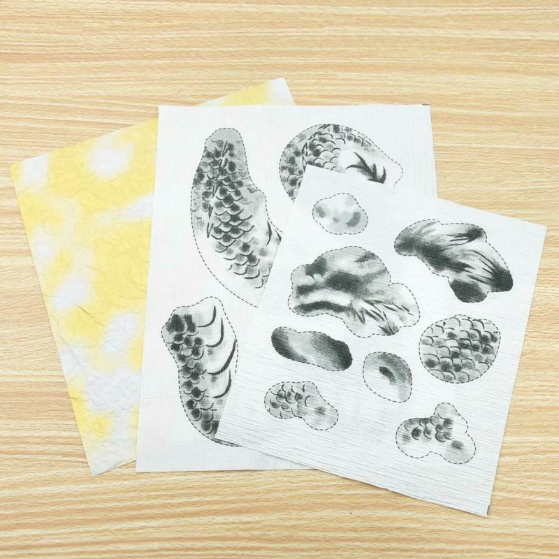 うろこなどの柄はあらかじめ「染め紙和紙」に印刷されているので見本通りに作ることができます。