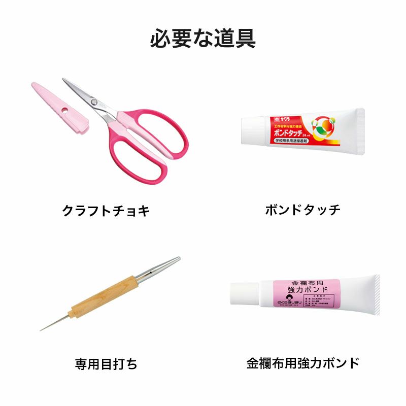 - クラフトチョキ、ボンドタッチ、布押絵用強力ボンド、専用目打ち、セロテープ