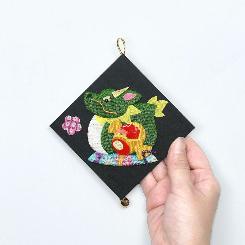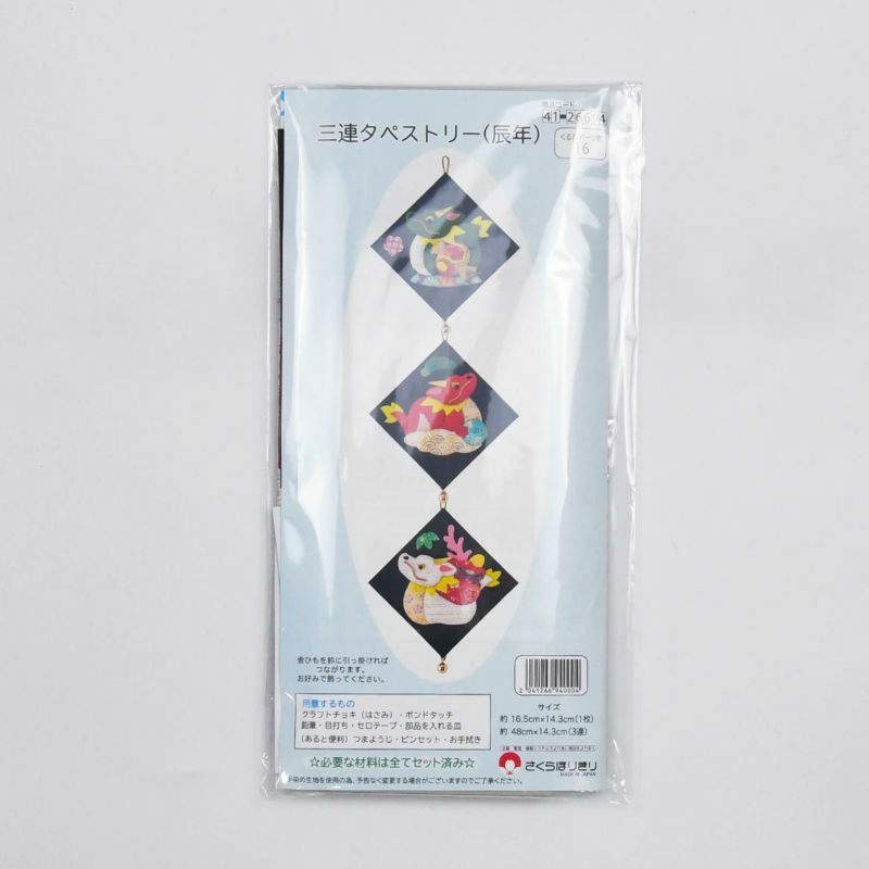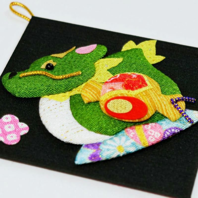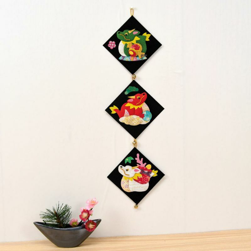 毎年大好評の干支の三連タペストリーは、一つでも、三つ繋げても飾れるところが人気です。それぞれ違うポーズの辰に松竹梅と縁起物をあしらいました。それぞれの色にも意味があります。