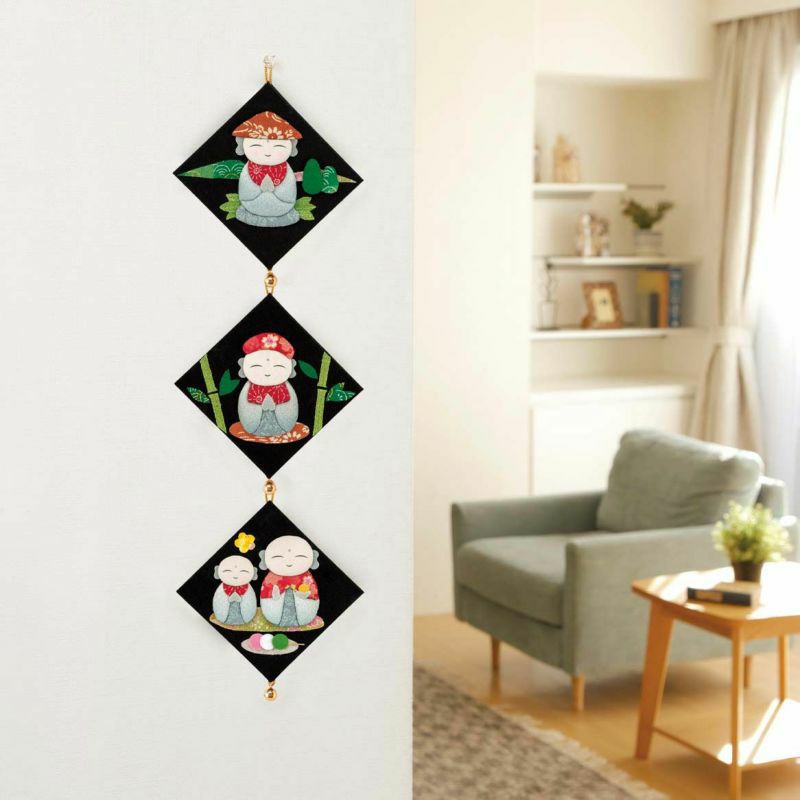 1つずつ飾っても、つなげて飾っても素敵な三連タペストリー。ほっこりとした優しい雰囲気のお地蔵さんに癒されます。季節を問わずに飾れるのも嬉しい一品です。