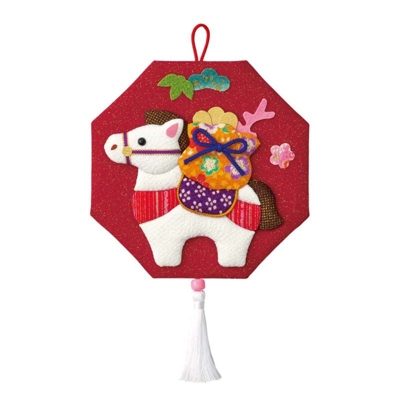 サンゴや小判でいっぱいの宝袋を背負った白馬が可愛らしい押絵。幸福を運ぶ縁起の良いデザインです。房飾りもついているので、簡単ながらも完成度の高い華やかな作品に仕上がります。