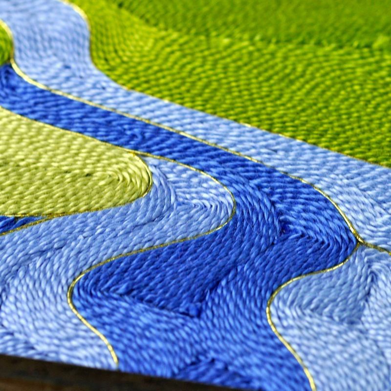 キラキラ輝く水面を表現するために、川には金糸を使用し縁取りをしています。