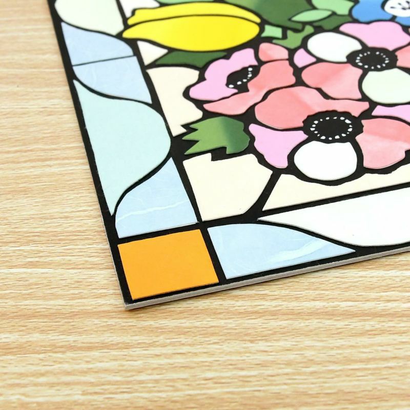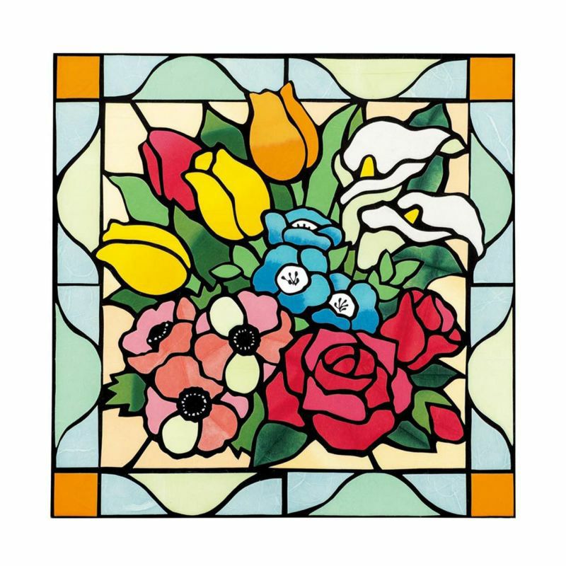 カラフルなステンドグラス風のデザイン。和紙の染めやぼかしを活かして作ります。