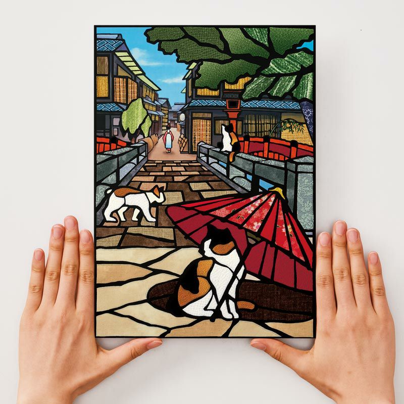 祇園白川の日本の美を感じる情景に鮮やかな唐笠の色が映えます。別売りの額に入れることでより作品が際立ちます。