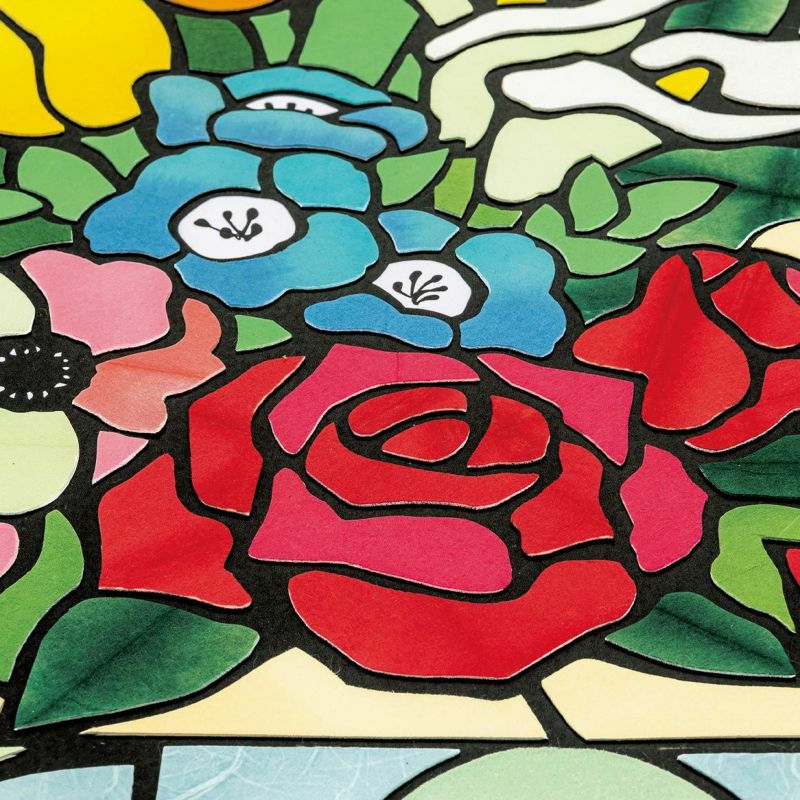 カラフルなステンドグラス風のデザイン。和紙の染めやぼかしを活かして作ります。
