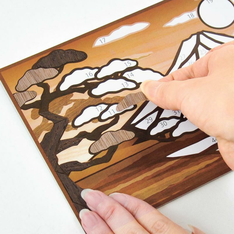 - 3で切り取ったパーツの裏紙をはがし、下絵ボードの指定番号に貼っていきます。