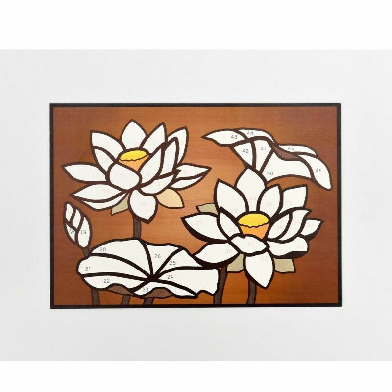 蓮の花床(かしょう)部分や細かい部分はあらかじめ下絵に印刷がされています。木のシートを貼って作る部分がほとんどですので満足度は高い絵柄です。