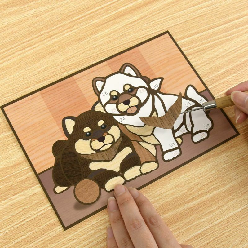 温かみのある木の風合いを生かして表現した柴犬は、別売りの額に入れて飾るとお部屋のインテリアにもなり素敵です。