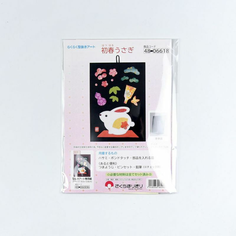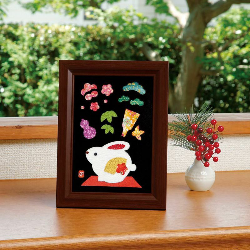 可愛らしい土鈴のうさぎに、松竹梅・瓢箪など縁起の良いモチーフを入れ込みました。布を直線で切って貼るだけのかんたんキットですが、完成度は高く、国産ちりめん布など素材にもこだわっているので、満足していただける一品です。