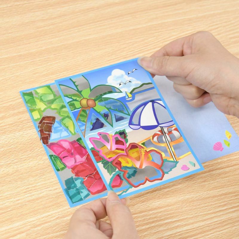半透明のシールを貼ると模様が透けてみえるよう、細かな柄は下絵に印刷済みです。使用するカラーシールの色の種類が増え、今まで以上に多彩な表現ができるようになりました。
