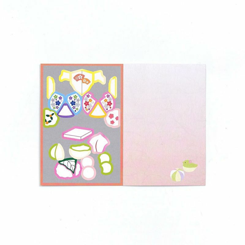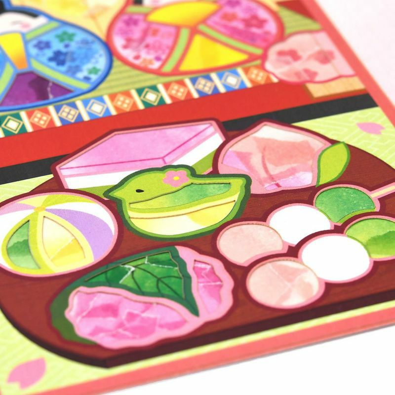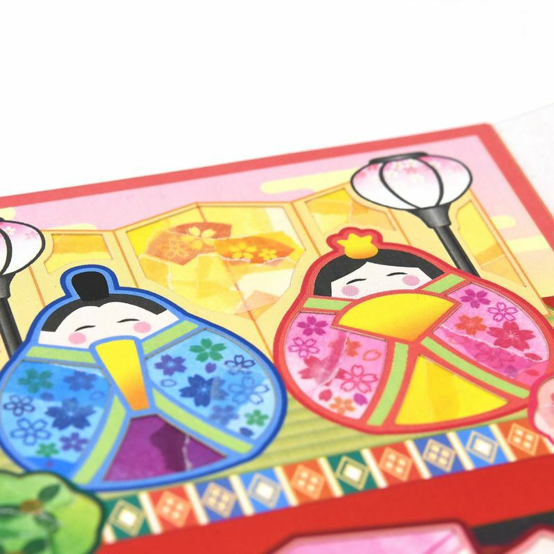 お雛様のお着物の柄は下絵にあらかじめ印刷されています。上からシールを貼ると柄が透過しリアルな仕上がりになります。