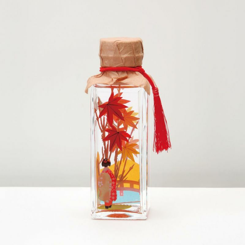 - 瓶に1cm程度オイルを注ぎ、3で作った透明シートを入れてそれぞれ側面に沿わせていきます。