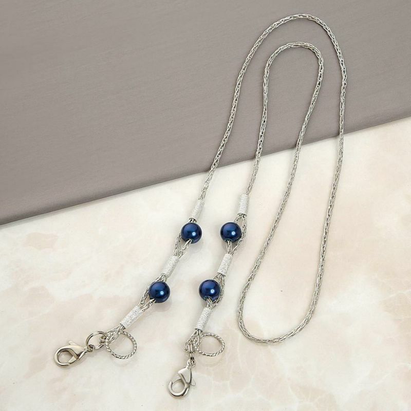 ミッドナイトブルーのパールビーズを使用。チェーンを通しやすいように太穴加工を施しています。大きい穴なのでストレスもなし!