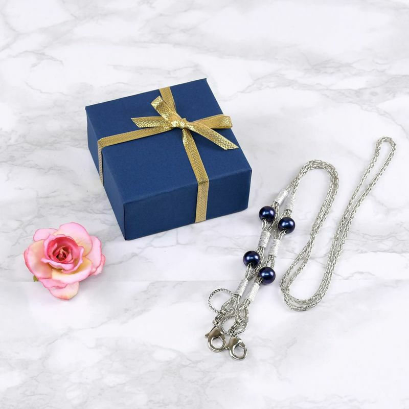 ミッドナイトブルーのパールビーズを使用。チェーンを通しやすいように太穴加工を施しています。大きい穴なのでストレスもなし!