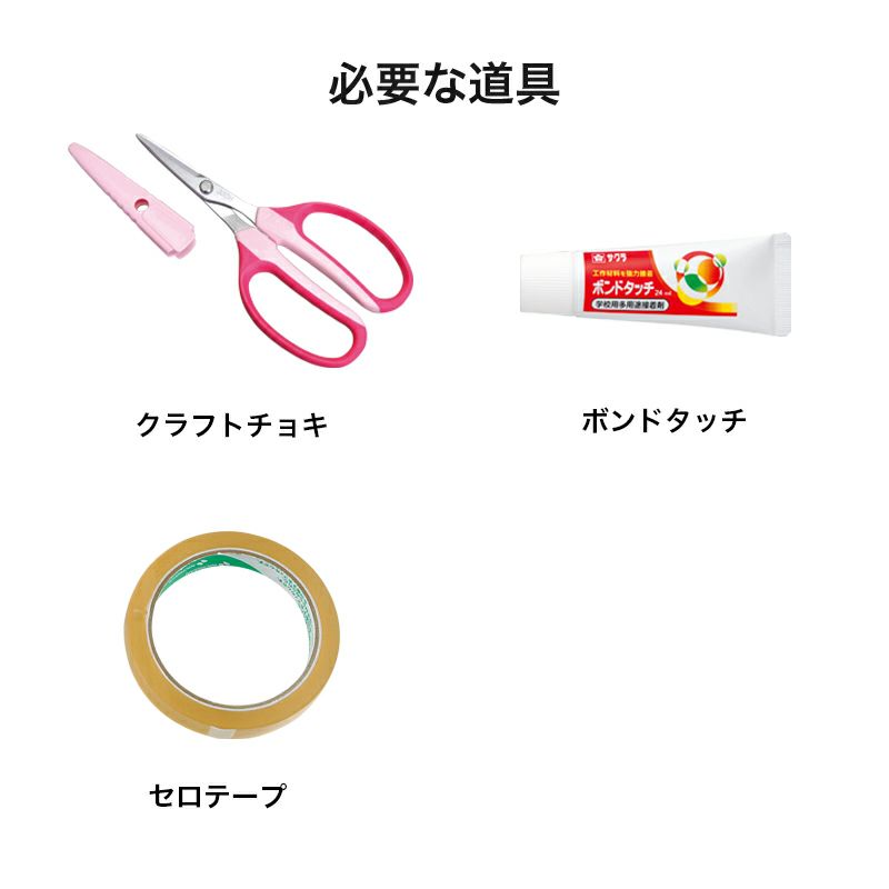 - はさみ、セロテープ、ボンドタッチ、ホチキス
