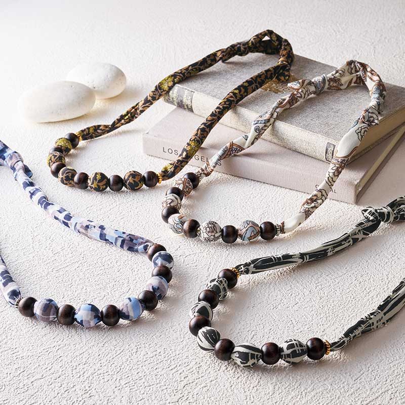 ネックレス本体の布はスムース生地といわれる素材で、なめらかな肌触りと高い伸縮性が特徴。直接肌に触れてもストレスを感じにくい布です。