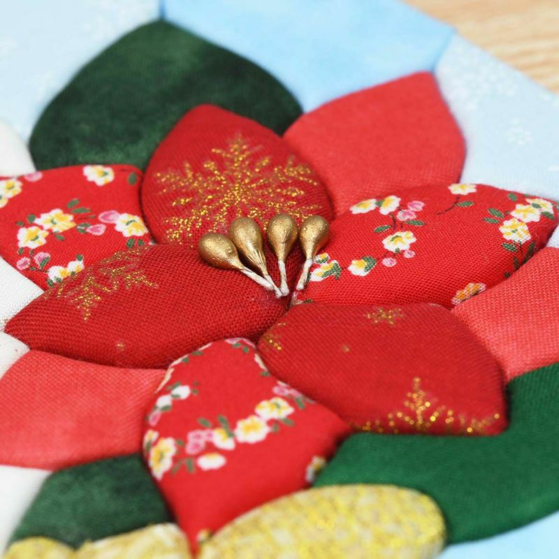 きらびやかな雰囲気を出すために、金柄の布や金ラメの生地で華やかさを表現します。比較的きめこみやすいコットン生地を使用しています。