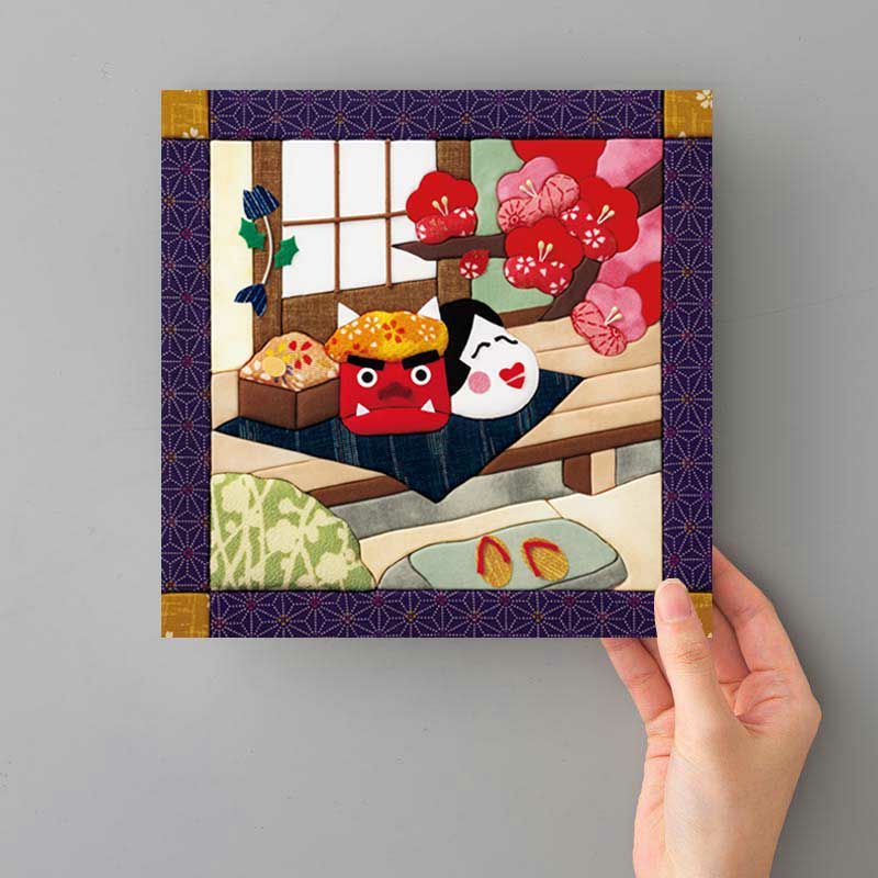 一年を月ごとの風物詩で表現する「歳時記シリーズ」2月は梅がほころぶ様子に春の訪れを予感させる節分の絵柄。豆まきが始まる前の心弾む風景を色柄の楽しい布で表現します。
