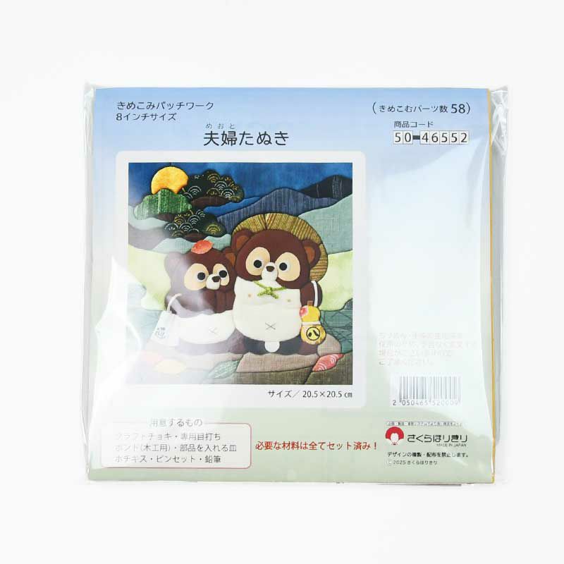 ふわふわのわた布で仕上げる、温もりある雰囲気の仲良く寄り添う夫婦たぬき。別売りの額に入れるとより作品が際立ちます。