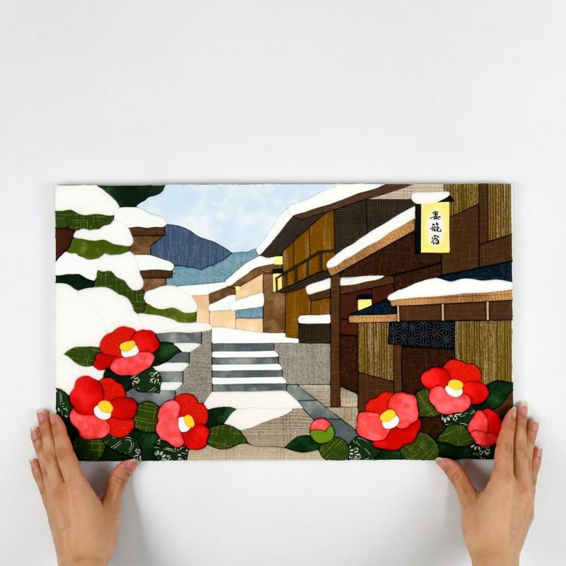 お手持ちの額に入れてお部屋に飾ると彩りをもたらしてくれます。妻籠宿の雪景色に赤の椿が映えます。