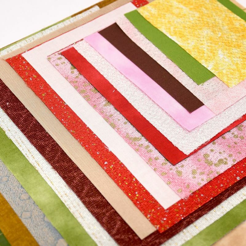 光沢のある緑色の厚い葉が特徴の椿。4種類の緑布を使い、柄遊びをしながら葉を表現します。