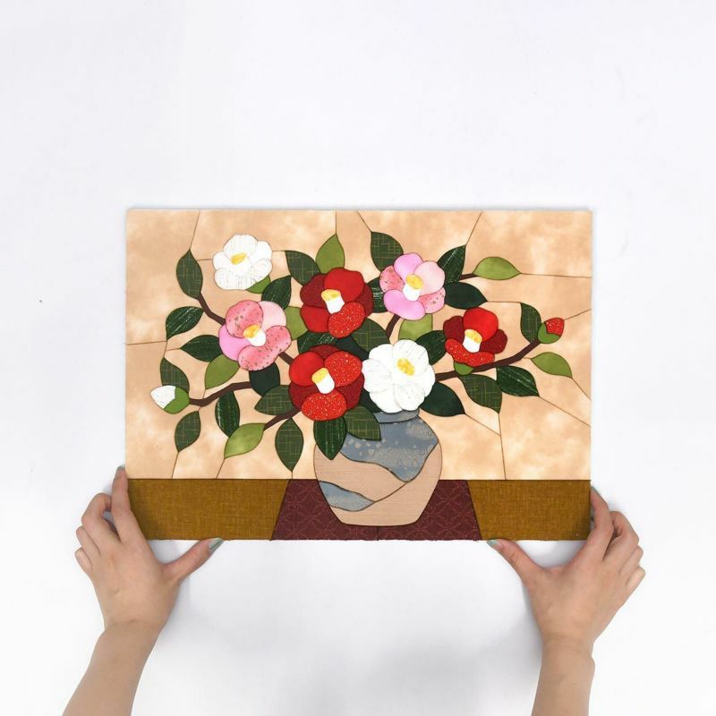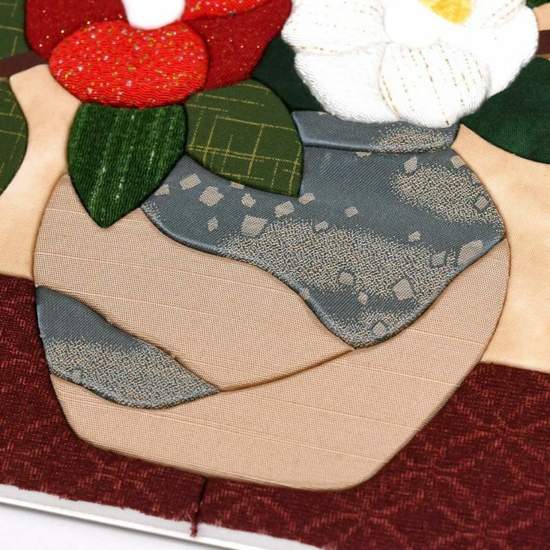 光沢のある緑色の厚い葉が特徴の椿。4種類の緑布を使い、柄遊びをしながら葉を表現します。