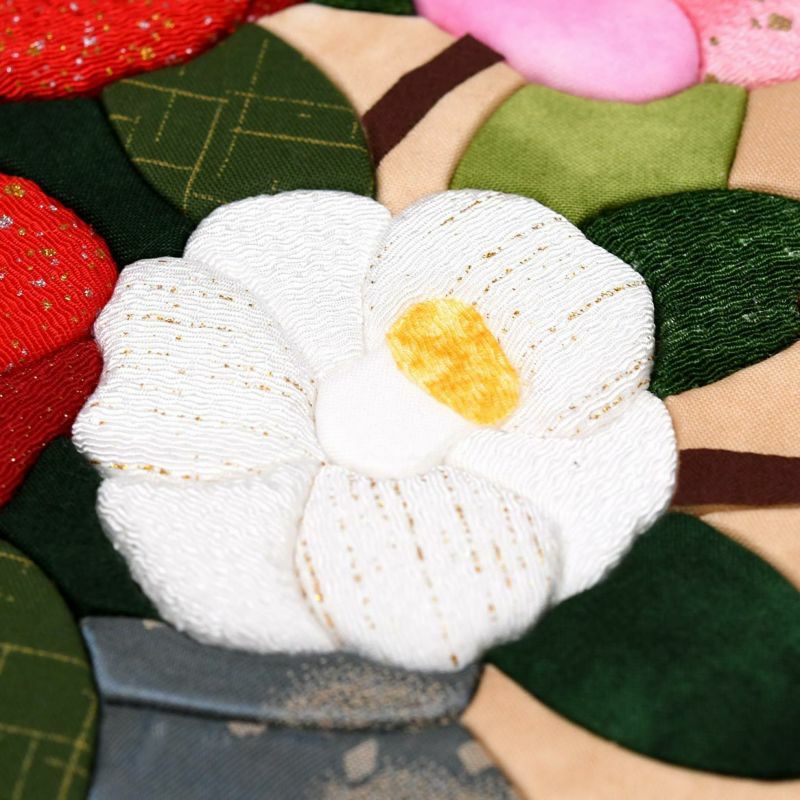 椿は赤、白、ピンクと活けて華やかにまとめています。花びらが単調にならないようにそれぞれ布を変えて仕上げます。