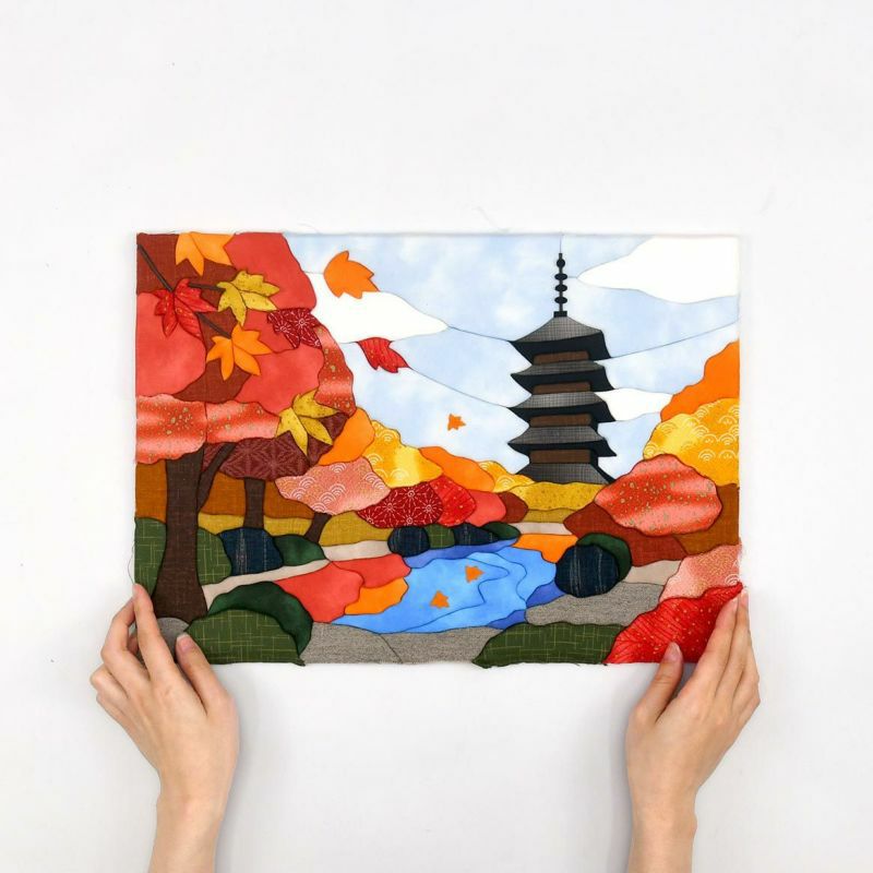 秋の庭園の豊かな色彩を表現するために、紅葉の黄色や赤い部分だけでも厳選された布を12種類も使用しています。