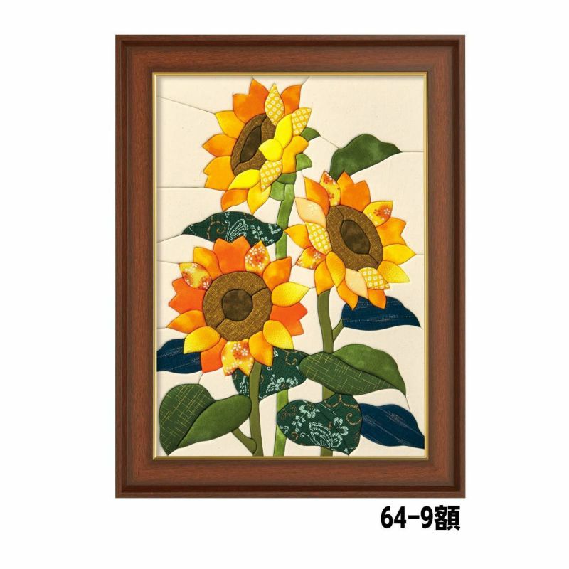 ひまわりを8種類の布を使って繊細に表現するとともに、布を配置を工夫をすることで立体感が出るようにします。