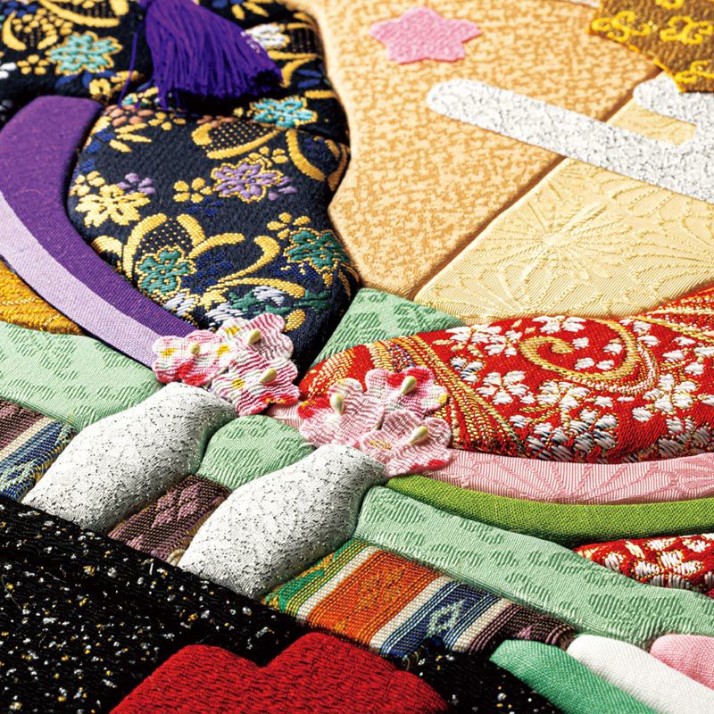 男雛のお着物は「繁栄」や「豊かさ」意味する桜柄、そして女雛には桜とともに、穢れや災厄を流す意味のある観世水の柄の金襴布です。それ以外の部分にはちりめん布やジャガード、コットンなども使用し、様々な布をきめこんでいく楽しさも感じていただけます。