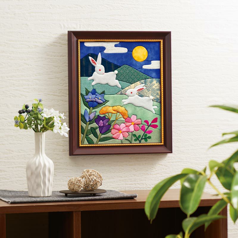 月夜の跳ねうさぎを上品な和柄で作る趣深い絵柄。別売りの額に入れて飾ると作品が引き立ち、お部屋をシックに彩ります。