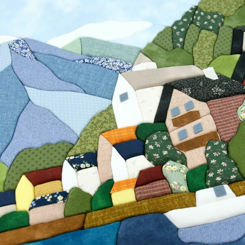 オーストリア・ハルシュタットの風景。映画「サウンド・オブ・ミュージック」の舞台と同じ地域にある有名な景勝地です。雄大な山々に抱かれた美しい街並みと澄んだ湖畔を、多様な布地で作ります。