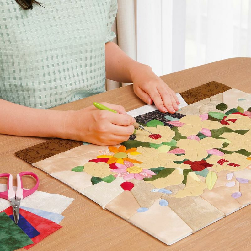布を溝にスーッとなぞるだけのシンプルな工程なのに、完成度は本格派のパッチワーク!
