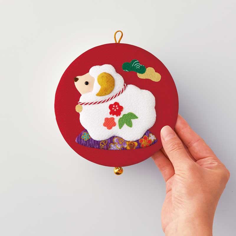 ひつじの白と土台の赤が引き立て合う、紅白のおめでたい色使い。紅白の紐や松竹梅の小物もあしらって、いっそう福を招く晴れやかな雰囲気に仕上げます。