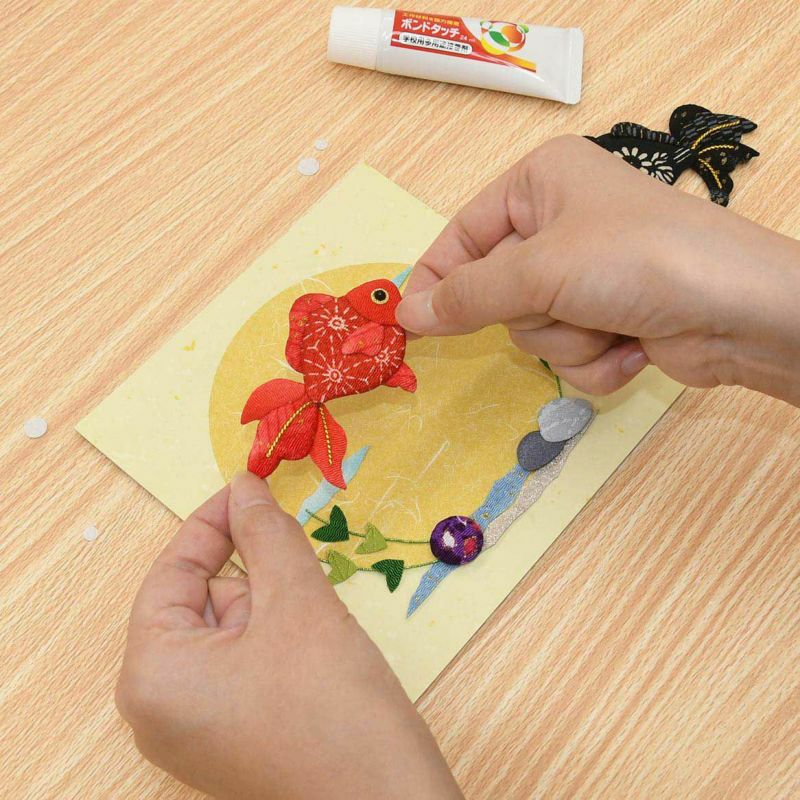 はり出した目がチャームポイントの出目金と丸みを帯びた体型と優雅なヒレが特徴的な琉金を、押絵でふっくらと仕上げます。