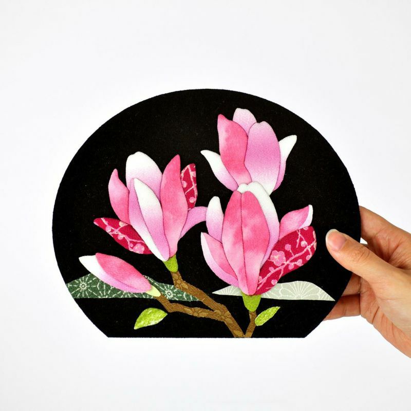 木蓮の花びら一つ一つにグラデーション生地や柄布を効果的に使い、立体感のある仕上がりにしています。