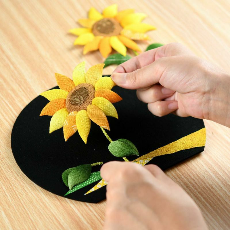 ひまわりの花びらにはグラデーションや柄など4種類の黄色いちりめん布を使用して立体感を出しています。