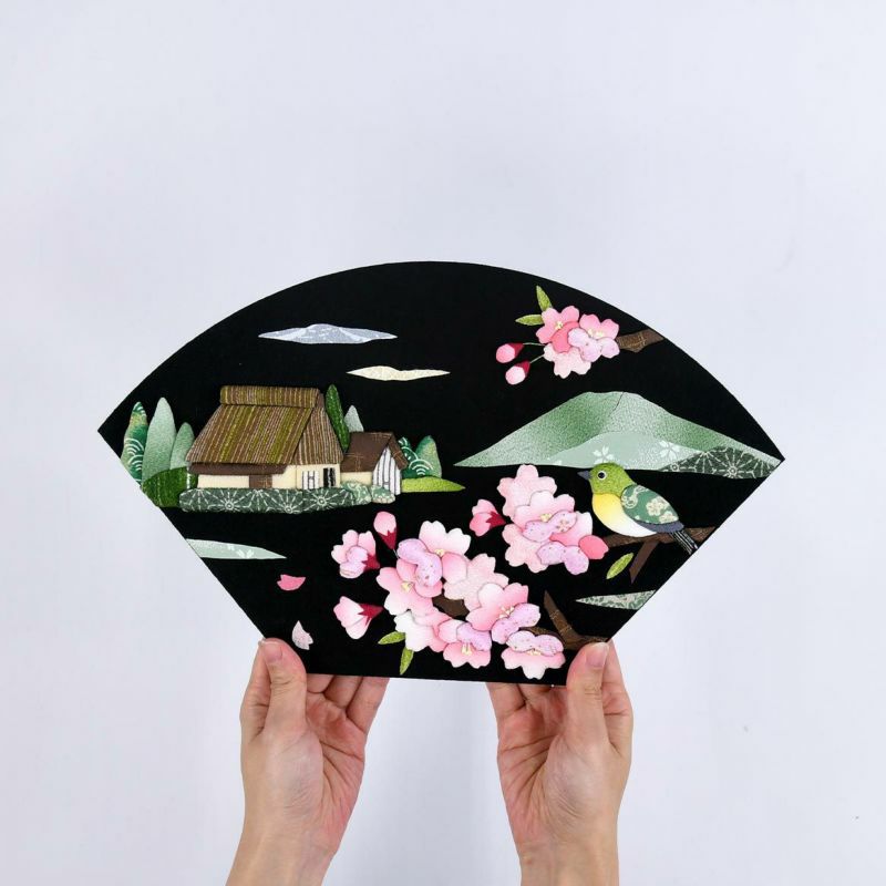 黒地の土台に色鮮やかなモチーフが映えます。土台は末広がりで縁起の良い扇型にしています。