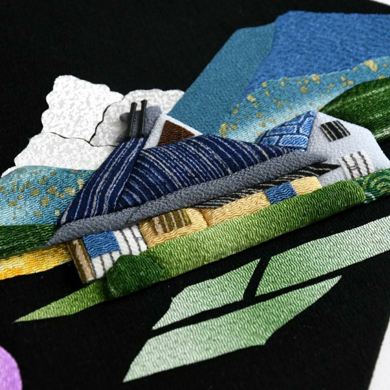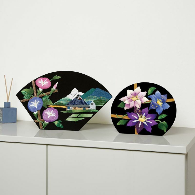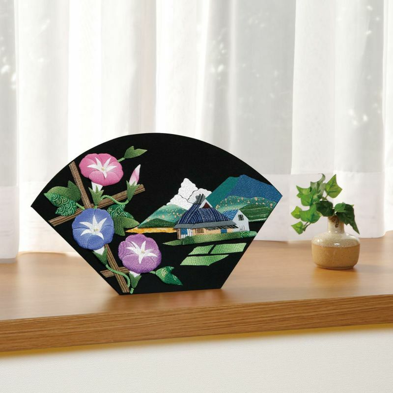 土台は末広がりで縁起のよい「扇」型。黒地なので色鮮やかな押絵パーツがより映え、際立ちます。