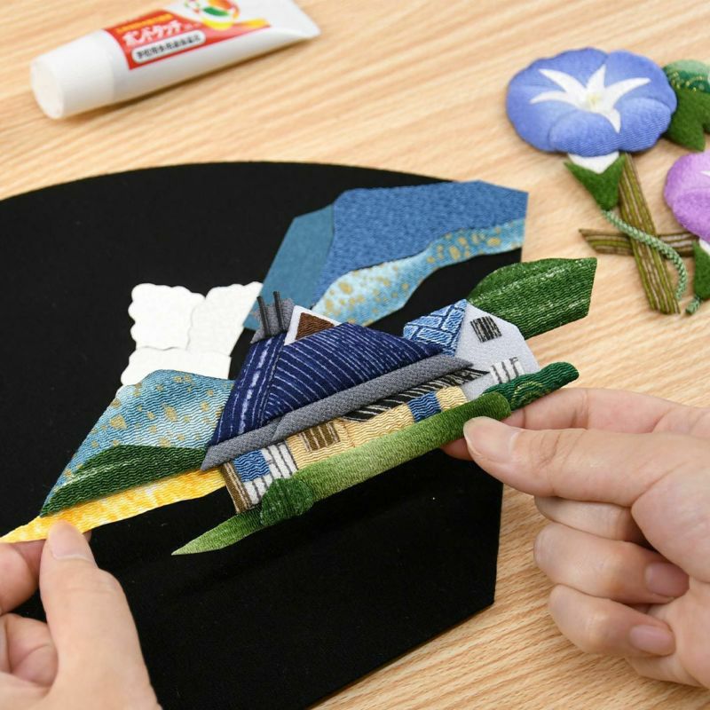 朝顔はちりめん布のグラデーションを活かし立体的に見えるように表現します。花の色は上品でみずみずしい色を選びました。